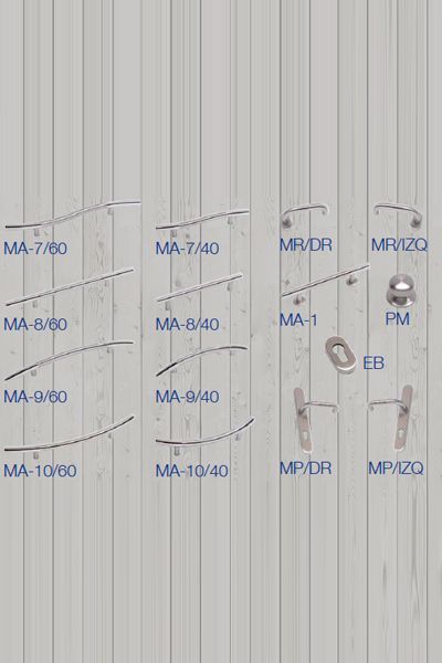 Disponemos de diferentes modelos de herrajes fabricados en acero inox.: MA-7/60, MA-7/40, MR/DR, MR/IZQ, MA-8/60, MA-8/40, MA-1, PM, MA-9/60, MA-9/40, EB, MA-10/60, MA-10/40, MP/DR y MP/IZQ.